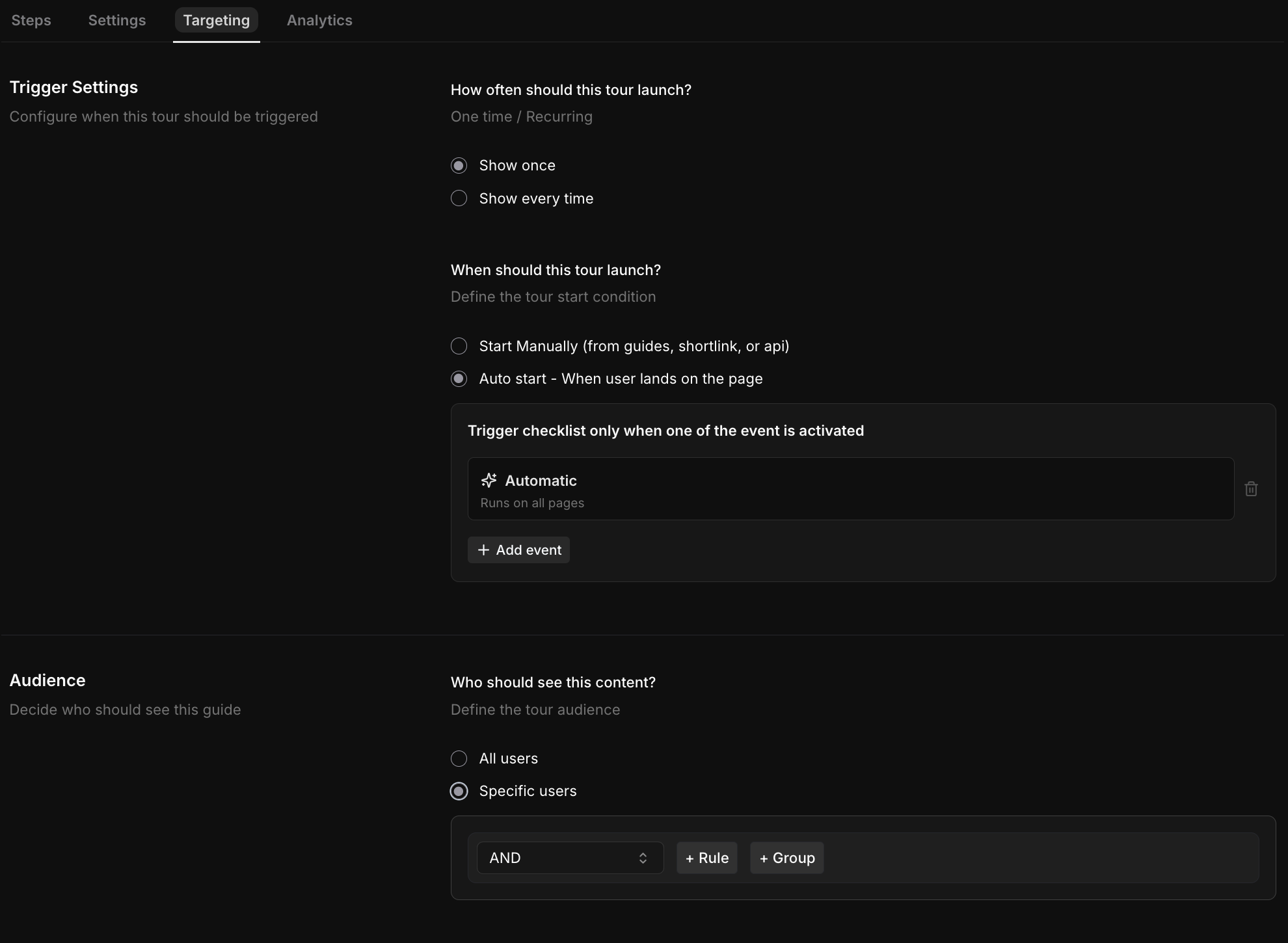 Targeting: Choose who sees the survey (e.g., specific user segments, behavior-based triggers)