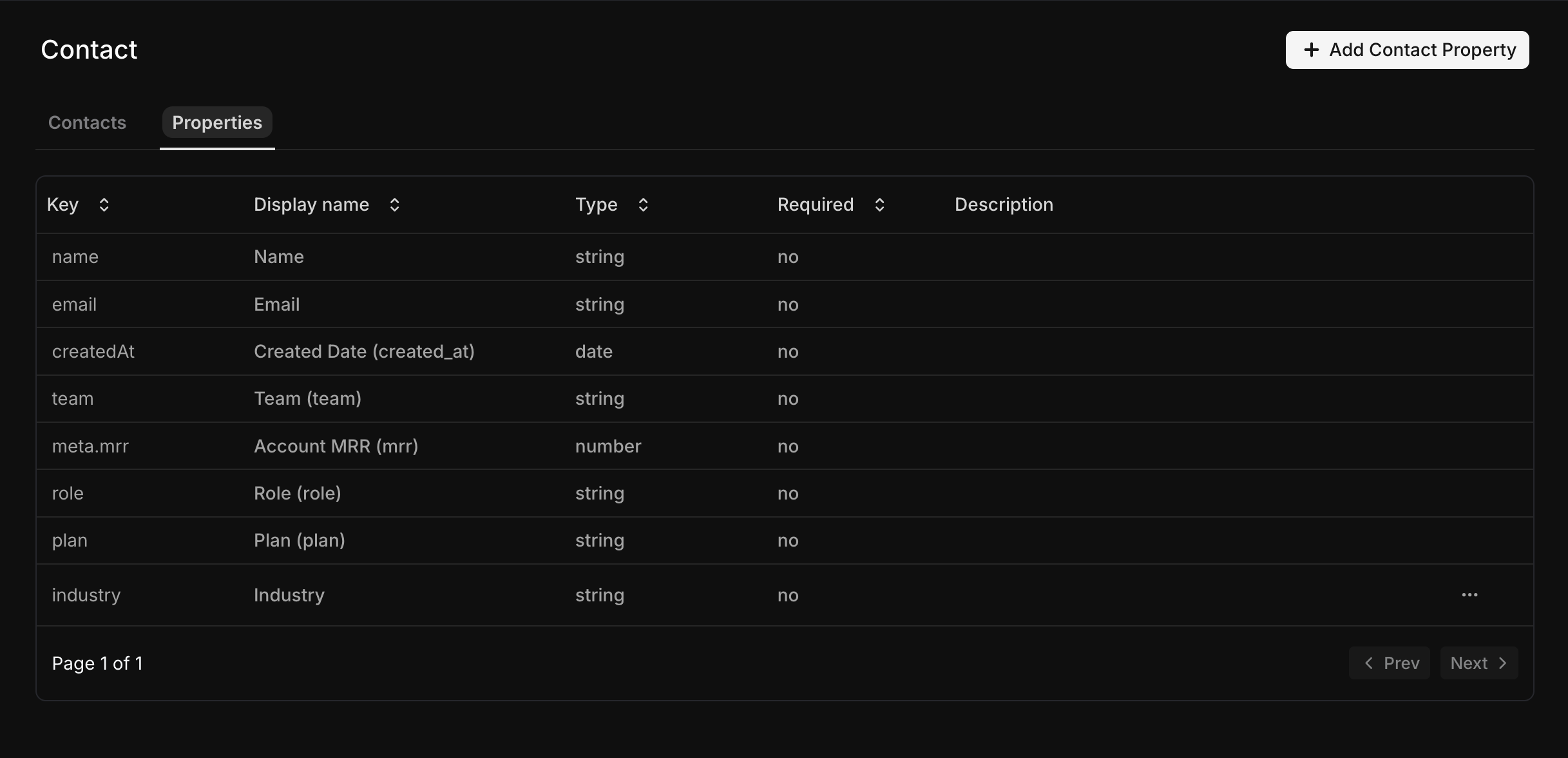 Click the "Add Contact Property" button to create new custom properties for tracking additional user information like plan type, role, industry, or other relevant data points.